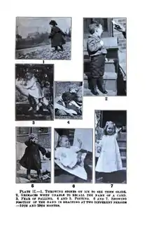 Plate II.—1. Throwing stones on ice to see them glide. 2. Grimaces when unable to recall the name of a card. 3. Fear of falling. 4 and 5. Pouting. 6 and 7. Showing position of the hand in reaching at two different periods—10th and 29th months.