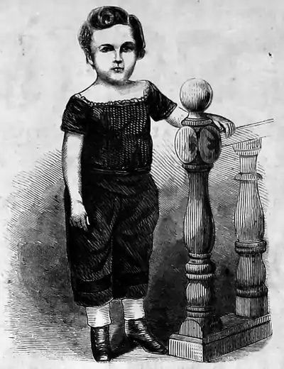 A boy named Robert Struck, seven years old; full, rosy face, curly brown hair and brown eyes; was dressed in a brown jacket, and ⟨black pants⟩ buttoned thereto; was lost ⟨on Saturday⟩, April 16th, 1864, about noon; was last seen near the Hoboken Ferries and the Morris and Essex Railroad Depot in Hoboken. By returning him, or leaving information with his mother, at 57 Washington street, Hoboken, any one will receive the reward. N.B.—The above photograph was taken two years since; the general features are about the same.