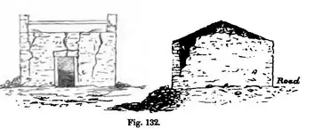 and south walls, near the quoins, and over the entrance door, the lintel of which, a single slab of limestone of about 12 in. by 22 in. wide, is fractured right through by the rocking of the wall at either side of it. The roof is all fallen in, except one purlin, which is still in situ, and proves, on examining its ends in the gable walls, that the east gable, and the roof along with it, all came to the eastward, at the first movement of shock, drawing the purlins from their sockets in the west gable; some were drawn quite out, and the roof at once fell in; others returned by the back stroke of the wave, and drove the ends of the remaining purlins, back again into their sockets like battering rams, throwing out portions and dislocating the west gable. The north-west quoin has had a long wedge-shaped mass projected right outwards, showing a very steep angle of emergence. The dislocations generally, here and at the opposite side of the road, give evidence of a wave-path from E. to W., and an angle of emergence of upwards of 45° with the horizon. I did not measure any