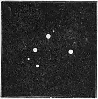 Fig. 31.—The Multiple Star (Theta Orionis) in the great nebula of Orion.Such, too, is the translucency of nebulous material that it is at least a conceivable hypothesis that the nebula might be the object which lay in the foreground and that the star occupied a position billions of miles in the rear, but that from where we were situated our line of sight towards the star conducted our vision directly through the centre of the nebula.