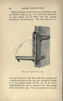 Different forms of the Cotgreave Automatic Step are shown in Figs. 35-37. It consists of a metal box or case, which can be fitted into the upright divisions of the bookcases. The step, when not in