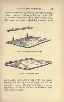 news-rooms for holding back numbers of newspapers is the "Banbury," shown in Fig. 54. It is made in polished wood, with nickel-plated metal-work. The spring arm, when pulled down, stands out at
