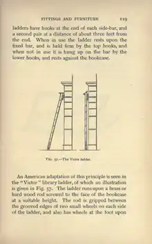 An American adaptation of this principle is seen in the "Victor" library ladder, of which an illustration is given in Fig. 57. The ladder runs upon a brass or hard wood rod screwed to the face of the bookcase at a suitable height. The rod is gripped between the grooved edges of two small wheels on each side of the ladder, and also has wheels at the foot upon