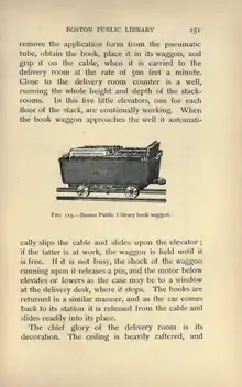 cally slips the cable and slides upon the elevator; if the latter is at work, the waggon is held until it is free. If it is not busy, the shock of the waggon running upon it releases a pin, and the motor below elevates or lowers as the case may be to a window at the delivery desk, where it stops. The books are returned in a similar manner, and as the car comes back to its station it is released from the cable and slides readily into its place.