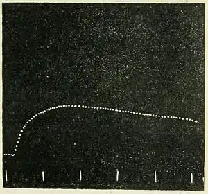 Experiment 11.—I took a specimen of hooked tendril, and excited it by an electric shock. The response was by the greater contraction of the more excitable convex side, on account of which the curved specimen tended to open out. The record of this response is seen in Fig. 11;