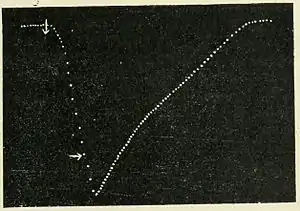 Effect of Increased Turgor: Experiment 12.—A young Mimosa plant was carefully transplanted and the root embedded in soil placed in a linen bag. This was held securely by a clamp, and one of the leaves of the plant attached to the recorder. Withholding of water for a day caused a general loss of turgor of the plant. A vessel full of water was now raised from below so that the linen bag containing the roots was now in water. The effect of increased turgor by suction of water by the roots became apparent by the upward movement of the leaf. The distance between the immersed portion of the plant and the leaf was 2 cm. and the up-movement of the leaf was indicated within 10 seconds of application of water (Fig. 13). The velocity with which the effect of