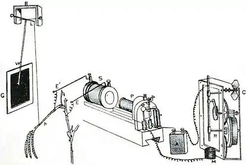 Fig. 14. Diagrammatic representation of the complete apparatus for determination of diurnal variation of excitability. Petiole of Mimosa, attached by thread to one arm of lever L; writing index W traces on smoked glass plate G, the responsive fall and recovery of leaf. A, primary, and S, secondary, of induction coil. Exciting shock passes through the plant by electrodes E, E. A, accumulator. C, clockwork for regulating duration of tetanizing shock. Primary circuit of coil completed by plunging rod, V, dipping into cup of mercury M.