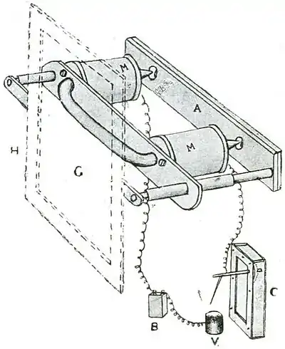Fig. 15. The Oscillator. Electromagnet M, M′, periodically magnetized by completion of electric current by clockwork C. Periodic attraction of soft iron armature A moves attached glass plate G to left, making thereby electric contact with writer.