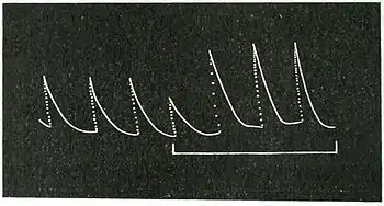 Fig. 18. Effect of change from darkness to light. The first three records are normal under darkness. Horizontal line below indicates exposure to light. Note preliminary depression followed by enhancement of excitability.