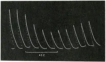Fig. 22. Effect of temperature above optimum. Note depression of excitability induced by high temperature, and gradual restoration on return to normal.