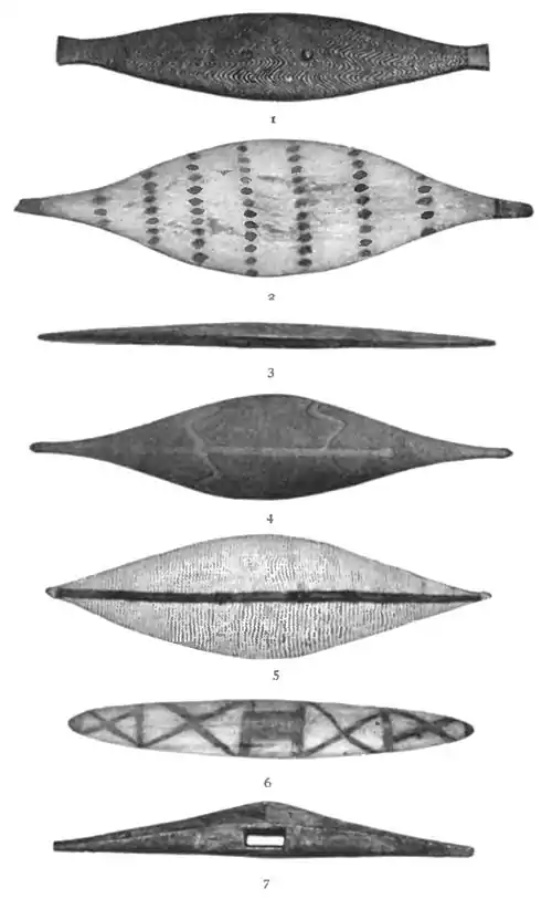 FIG. 16.—NOS. 1, 2, 4, 5, SHIELDS USED TO WARD OFF SPEARS; 3, 6, 7, SHIELDS FOR CLUB FIGHTING.