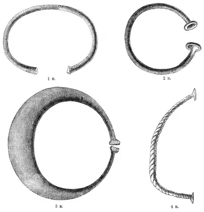 Figure 3 b exhibits a gold collar, one perhaps of the earliest known types. It is called the “funicular,” from the shapes of the cup-like termini. This gorget is peculiarly Celtic: similar examples are frequently found in Ireland, some also in Europe. It was probably worn as a collar round the neck, although some authorities have suggested that it might have been worn on the top of the head with the circular ends behind the ears.