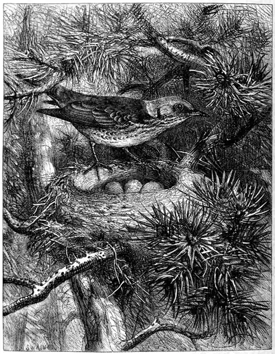 of large trees. We have seen nests often in the first cleft of detached chestnuts. Nests are also common in Scotch-fir plantations, where they are easily found. Ground nests are never numerous, and they are always built about precipices.