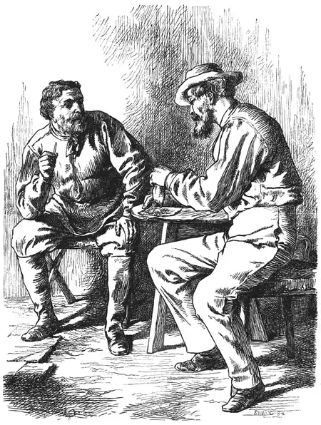 It was about midnight, towards the latter end of the month of June, that I stepped out of the Red-shirt store into the still, silent night. It was full moon, and clear and distinct as at noonday I could see the opposite bank of the gully, dotted with here and there a tent, while hundreds of bare poles and deserted chimneys told the tale of a diggings once prosperous, but now rapidly declining. Below me I could hear the swollen creek foaming and fretting in its bed, but its waters were invisible, for a dense mass of fog, which rose to within a few feet of where I was standing, brooded over and concealed them. On the opposite side of the gully, some twenty feet above the fog level, stood a solitary tent, the sparks issuing from the chimney of which showed that its occupant kept up a good fire.