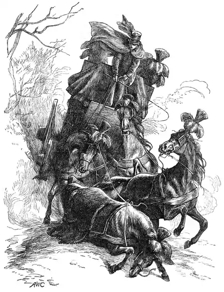 “At first it had been easy work trotting round to the undertaker’s, and then to the door where we took up, but now I began to find that my horses were anything but slow and steady. An uneasy lifting of the hind-quarters of my leaders made me extra careful, and long for the time when, having deposited my burden, I could trot back to town, with the mutes sitting on the hearse, laughing, talking, and smoking, as is, or used to be, the unseemly custom. All went