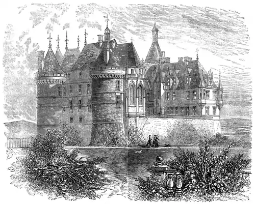 It was in this castle that Queen Margaret of Anjou was reconciled to the Earl of Warwick, her former foe, through the mediation of the crafty Louis XI. There is the most perfect gem to be seen here; such a specimen of florid Gothic architecture as can hardly be surpassed—I speak of a little chapel in the castle gardens built by Anne of Brittany: it is dedicated to St. Hubert, the patron saint of hunters. The delicately sculptured foliage, everywhere adorning the edifice, is of matchless beauty; the leaves with their fibres; the crisp curling of their edges; are all more like carving in ivory than in stone. And now we pass away from the blood-stained walls of Amboise, and the scene is occupied by the Château of Chenonceau; but though the souvenirs connected with this castle are numerous, they are widely different in character from those we have just alluded to. Here, again, Francis I. (as at Chambord) was the founder; but, unlike the former castle, this was built during the most joyous days of his prosperity; it is actually built on the river Cher, as part of it is raised on the bridge that crosses the stream. It is almost unaltered since the days of its erection, a fact which makes it most delightfully interesting to the explorer. All the curious old furniture, the matchless china, enamel and glass, are there in all their pristine freshness and beauty. Magnificent old armour hangs all round the hall, and the walls of the apartments are covered with that curious old stamped leather well known to antiquaries; the gorgeous ceilings are blue studded with gold stars. The very drinking-cup used by Francis and the lovely Mary Queen of Scots’ mirror are also shown; but perhaps its greatest attraction consists in the celebrated people who have resided within its walls.