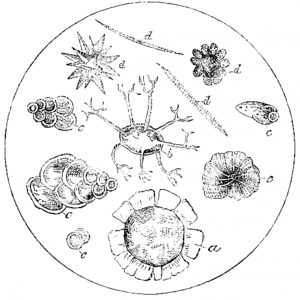 Selecting a dark specimen, and breaking it with a smart blow into fragments, we shall readily procure several bits thin and transparent enough to bear investigation under the microscope. From these pieces it will be easy to select many which exhibit white dots; others, dark points, or yellowish streaks and patches. Under the lens these little marks resolve themselves into well-preserved and very beautiful fossils, the white dots will turn out to be Foraminiferæ of precisely similar form and species with the chalk builders; the yellowish discolorations will be manifestly due to the presence of silicified sponge tissue, while the remaining organisms will most likely comprise spicula of various kinds and several Xanthidia. We give below a figure of each of these as they appear when highly magnified.