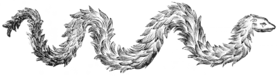 “Amongst serpents,” writes Dr. Owen, “authors place dragons—creatures terrible and fierce in aspect and nature. They are divided into Apodes and Pedates, some with feet and some without them; some are provided with wings, and others are destitute of wings and feet. Some are covered with sharp scales which make a bright appearance in certain positions. Dragons have been observed about the Ganges, “whose eyes sparkle like precious stones.” In Ethiopia—a favourite venue of our author’s, by the way, for marvellous annals—the ordinary land-dragon grows to be thirty paces[1] long, and kills elephants in this wise. He twines himself round the legs of his victims, and then, “thrusting his head up their nostrils, stings them, and sucks their blood till they are dead.” The accompanying fac-simile of this dragon’s portrait will show how admirably nature had adapted him—he is at least seventy-five feet long, remember,—for thrusting his head up the nostrils of an elephant.