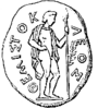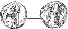 is in the British Museum. It is remarkable as a plated coin, being of copper covered with a thick coating of silver. Ancient plated coins were intended to pass as silver pieces. They are in general either forgeries of well-known currencies, as of Athens, or else they were issued by authority, as seems to have been done by the Tarentines, judging from their coins,