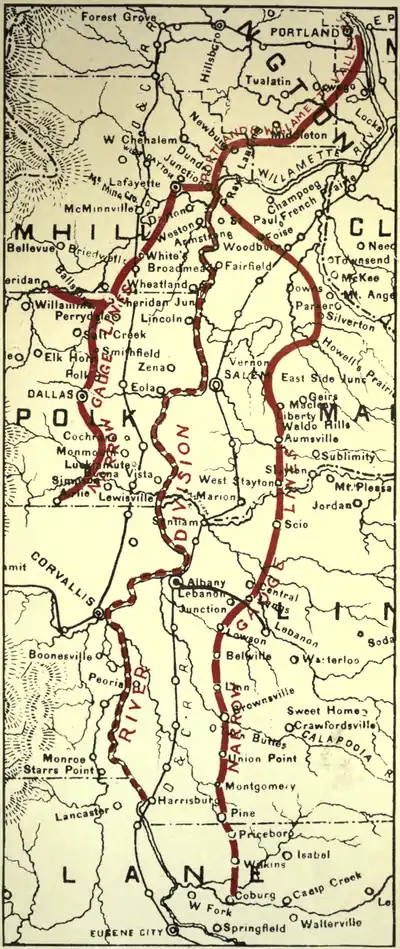 Route of Narrow Gauge Railroad in the Willamette Valley.