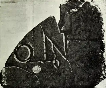 Large cake of Nehalem wax, showing engraved character. This cake, when whole, measured about 20 × 6 × 16 inches. Portland City Museum.