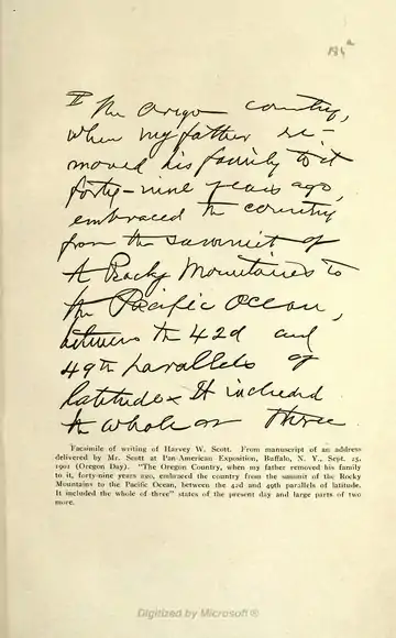 Facsimile of writing of Harvey W. Scott. From manuscript of an address delivered by Mr. Scott at Pan-American Exposition, Buffalo, N. Y., Sept. 25, 1901 (Oregon Day). "The Oregon Country, when my father removed his family to it, forty-nine years ago, embraced the country from the summit of the Rocky Mountains to the Pacific Ocean, between the 426 and 49th parallels of latitude. It included the whole of three" states of the present day and large parts of two more.