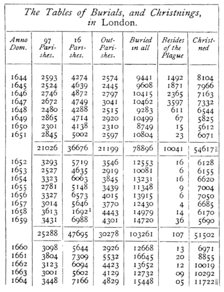 The Table following contains the Number of Burials and Christenings in the seven Parishes hereafter mentioned, from the year 1636 unto the year 1659[2] inclusive; all which time the Burials and Christenings were jointly mentioned: the five last years the Christenings were omitted in the yearly Bills. This Table consists of seventeen Columns, the Total of all the Burials being contained in the sixteenth Column: which Number being added to the Total in the precedent Table of Burials and Christenings, makes the Total of every yearly or general Bill. |119|