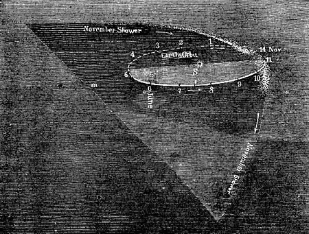 The history of the cosmical cloud does not, however, end with its transformation into a comet. Schiaparelli shows in a striking manner that, as a comet is not a solid mass, but consists of particles, each possessing an independent motion, the head or nucleus nearer the sun must necessarily complete its orbit in less time than the more distant portions of the tail. The tail will therefore lag behind the nucleus in