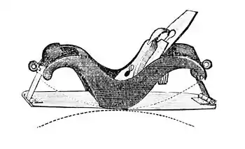 changes in the direction of the fibres of the wood as the longer length of the trying-plane could not conveniently deal with. Hitherto, we have regarded the plane as arranged with a "guide principle" which shall always repeat a straight, level surface. The guide may, however, be the counterpart of any required surface. The plane made of iron, now in my hand, has an elastic steel sole, which, by means of adjusting screws, enables a workman readily to convert a straight-faced sole into one either concave or convex. This is an American production (see Fig. 10).