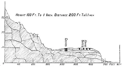 is wanting, as no animals save a small gray fox, and several species of land-birds, exist on the islands. The ground upon which the station is located is of a rocky, irregular structure, mostly bare and destitute of vegetation; a cove, affording an excellent boat-landing, adjoins to the westward of it; outlying rocks, of which but few appear in the sketch, are covered with edible shell-fish; a mass of kelp and sea-weed grows in the adjoining waters, and is thickly stocked with fish; a spring of potable water is found in the deepest part of the cove. Sand is found only at a distance of between four and five hundred yards to the eastward, in a small hidden beach of the narrow fiord of Tinker's Cove, which is of very difficult access by land, as the sides of the inlet form walls of over one hundred feet in height, and in larger quantities farther away to the westward of the station. It is,