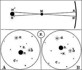 The figure illustrates the method of observation. Suppose two observers, situated one near the north pole of the earth, the other near the south. Looking at the planet, the northern observer will see it at N (in the upper figure), while the other will see it at S, farther north in the sky. If the northern observer sees it as at A (in the lower part of the figure), the southern will at the same time see it as at B; and, by measuring carefully at each station the apparent distance of the planet from several of the little stars (a, b, c) which appear in the field of view, the amount of the displacement can be accurately ascertained. The figure is drawn to scale. The circle E being taken to represent the size of the earth as seen from Mars when nearest us, the black disk represents the apparent size of the planet on the same scale, and the distance between the points N and S, in either figure A or B, represents, on the same scale also, the displacement which would