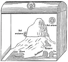 "According to Cosmas and his map of the world, the habitable earth is a plane surface. But, instead of being supposed, as in the time of Thales, to be a disk, he represented it in the form of a parallelogram, whose long sides are twice the shorter ones, so that man is on the earth like a bird in a cage. This parallelogram is surrounded by the ocean, which breaks in in four great gulfs, namely, the Mediterranean and Caspian Seas, and the Persian and Arabian Gulfs.