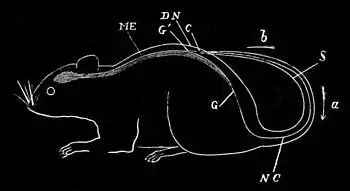 Fig. 2.—M E, spinal marrow. N C, nerve-fllament distributed to the end of the tail. G, its trophic ganglion. D N, a, nerve-filament distributed to the skin of the back, lacerated in the operation. G, its trophic ganglion. C. the cicatrix which united the two nerves, and which is now permeable to nervous shocks. S, point where the tail was cut in two; a, b, arrows showing the two directions in which sensory excitations are transmitted.