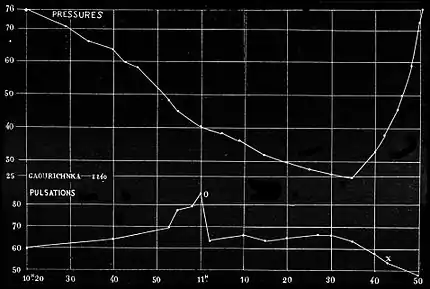 the results of that one of my experiments in which I reached the lowest degree of pressure. My pulse had grown more frequent, having risen from 60 to 85; the pressure was then only 40 centimetres. I now began to inhale oxygen from the bag, and at once the pulse fell to 65, at which point it stood during the remainder of the experiment, and at last even fell to 48. In the mean while the pressure had fallen to 246 millimetres. This is exactly the pressure on the highest