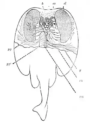Fig. 4. Torpedo. b, brain; eo, eye and optic nerve; el, electric organs; sn, spinal nerves; sm, spinal marrow; pg, pneumogastric nerves going to the electric organs; pg’, branch of the preceding; g, gills.