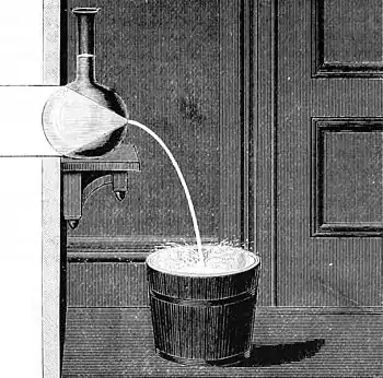 "How magical! The curving stream of water is full of light, and appears like a stream of molten iron. The spot where it falls seems touched with fire. Put your finger in the stream of water, and it is brightly illuminated. Of course, the water soon runs down, and the display stops. To prevent this, bring water in a rubber tube from the water-pipes in the house, and then regulate the supply so that the receiver may be kepi full as fast as the water runs out.