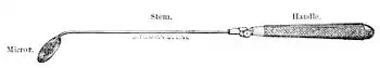 For the clearer comprehension of the reader, I here introduce cut No. 1, which depicts the laryngoscope, or laryngeal mirror. At the left end we see the mirror, which is set in a silver frame and back; this in turn is attached to a metal stem, and the stem itself is set in a wooden handle, which latter is merely a matter of convenience by which the physician is enabled to handle it with more ease and facility