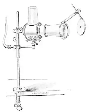 The lens g can also be removed at h. m is a brass arm having three joints, and fastened to the lamp. At the extremity of this arm is a perforated knob, s, through which the handle of the reflector, i, is passed, and which is fastened by a screw. At o is a single charniére joint, which permits of the forward or backward motion of the reflector—the illuminating agent being oil. By substituting gas burned through an Argand burner, and fed from any ordinary burner, the apparatus has been made more available, and better light obtained. The following cut represents the improved apparatus as now made.