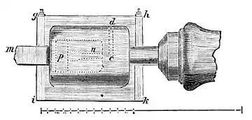 The whole mass being then secured in the apparatus used for boring (Fig. 2), a cavity 7.2 inches long and 3.7 in diameter was bored in b, in the direction of its axis, so that a metal bottom, 2.6 inches thick, remained between the borer and the neck. In this also a small round hole, c d (Fig. 3), was radially bored for the insertion of a thermometer. The cylinder, neck, etc., are represented upon a somewhat larger scale in Fig. 3.