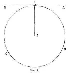 Fig. 1. curve E C D, and that the string E S feels a known tension, just equal to its strength. Now, double the velocity, and the strength of the string must be increased fourfold to keep it from breaking, for the force drawing the body toward the centre must then be four times as great to keep it moving in the curve. Or, suppose the body moves from A toward B with a known velocity, and that on reaching E is acted upon by the string. The body is then made to take a curvilinear motion, and the string feels a tension drawing the body not directly from but toward the centre, and equal to a force necessary to keep the body from moving in a straight line. It may be remarked that, as action and reaction are equal, the tension is felt both ways. But the reader can easily see what I mean.