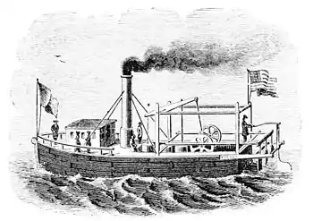 feet wide. The propelling apparatus was a system of paddles, which were suspended by the upper ends of their shafts, and moved by a series of cranks, one to each, taking hold at the middle, and giving them almost exactly the motion which is imparted to his paddle by the Indian in his canoe.