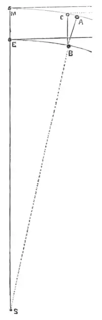 way of combining these numbers is unique. It is as if the moon had dropped toward the sun first .12084 of an inch, then .05386, while the earth had dropped toward the sun only .12144 of an inch. But Nature does not proceed in that way. The .05386 is a part of .12084, as the figure plainly shows. The .05386 is the moon's distance at A below the dotted line drawn from C, and .12084 is the moon's distance at A below the tangent drawn from M. It is easy to see that the latter includes the former. In the interest of science allow me to protest against such theories and such mathematics.