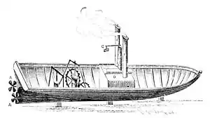 built another one, using the same engine as before, but employing a larger boiler, and propelling the vessel by twin-screws (Fig. 56[1]), the latter being another instance of his use of a device brought forward long afterward as new, and since frequently adopted.