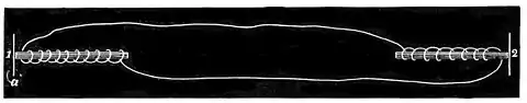We have here the fundamental principle of the telephone. No galvanic battery is employed to furnish an electrical current, as in the case of the telegraph; but the currents in the wires are produced by the motions of the piece of soft iron near the magnet. Thus far we have represented these motions in a very rude and coarse way, as if the piece of iron were vibrated backward and forward by the hand;