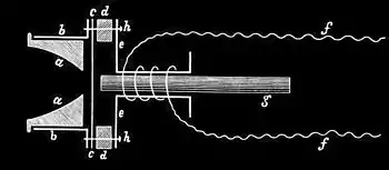 and with a flange one-half inch wide. Then from a ferrotype-plate—the photographer's "tin-type"—cut a round plate, shown edgewise, at c c, to cover the tube bb over the flange. This is the vibrator or diaphragm. Next cut a wooden ring or "washer," d d, the width of the flange, and about one-eighth of an inch thick. Then make a spool, e e, one inch long, of thin sheet-brass again, with one flange wide enough to cover the wooden ring, the tube of the spool being made so as to fit tightly the magnet g, which is a strongly-magnetized steel rod, four inches long and three-eighths of an inch in diameter. The parts will then fit together, and may be screwed firmly through the flanges b b. The least polished side of the plate c c should face the magnet, and it is well to scrape the part opposite the end of the bar, so as to expose the iron. The spool is to be wound with about fifty yards of No. 36 or 38 silk-covered copper wire, the thickness of a bristle. The magnet is then shoved in, till it nearly touches the plate c c. After joining the ends of the spool-wire to the line-wires f f, that run to another instrument just like it, the telephone will be ready for use. It is important to concentrate the voice upon a narrow space at the middle of the plate, and for this purpose a movable wooden mouth-piece, a a, is used, with an opening at the bottom about the size of a dime. This mouth-piece should fit neatly, and reach to within about one-eighth of an inch of the diaphragm.
