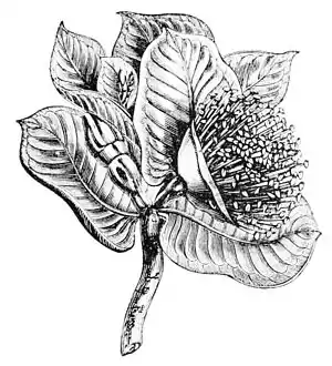 Owing to the bluish-green of its leaves, E. globulus is popularly known as the blue-gum tree. Abroad it is most known outside of its systematic name as the Tasmanian gum-tree, and Australian fever-tree. Among the settlers, gum-tree is the general name of the eucalypts. But, as might be expected of a genus so numerous in species, there are many trivial names, such as blue-gum, brown-gum, the red and the white mahogany, stringy-bark, and iron-bark, etc. The botanists reckon 150 varieties. These all belong to the great order Myrtaceæ, or myrtle-blooms. And a decidedly respectable relationship have these trees which shed "their medicinal gum," for they are close cousins to the well-known myrtle, the pomegranate, pimento, or allspice, cajeput, and clove. The flowers of this order are known in their structure as calycifloral. Perhaps this curious blending, or confusion, of the calyx and the corolla, is shown most interestingly in the flowers of these eucalypts. The calyx is really in two distinct parts, a woody cup below with an operculum or lid above. (See middle figure, bottom of cut 3.) When the flower is ready to open it pushes