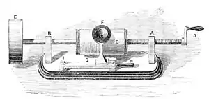 turned. On the surface of the cylinder is scored the same thread as on its axle. At F (shown in one-half scale in Fig. 2) is a plate of iron, A, about 1100 of an inch thick. This plate can be moved toward and from the cylinder by pushing in or pulling out the lever H G, which turns in an horizontal plane around the pin I.