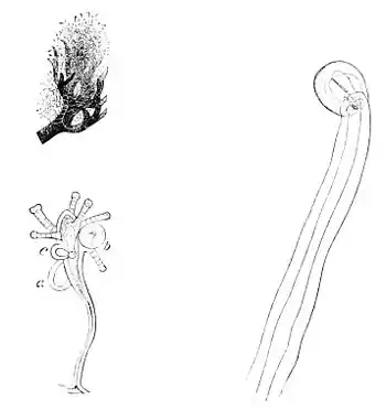 | Fig. 9.—Sarsia (Coryne) mirabilis (Agassiz). Cluster of Hydroids growing on sea-weeds. | Fig. 11.—Sarsia (Coryne) mirabilis (Agassiz). Adult, Massachusetts Bay. | |
