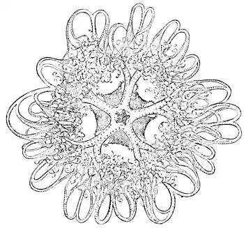 Allusion is made above to the brittleness of the serpent-stars. This sort of brittleness is not confined exclusively to these echinoderms: at least one species of starfish exhibits the same property. The lamented Prof. Edward Forbes tells a story of his experience with a starfish known as Luidia, which shows that it equals any serpent-star in brittleness. The professor went dredging for the Luidia. He brought up a fine specimen and laid it on one of the benches in the boat, and went on with his dredging. When he was ready to go home he found his Luidia in fragments. It had gone to pieces of its own accord—probably by contraction. Much disappointed by the loss of so desirable a specimen, he determined to take great precautions when he should capture another Luidia, that he might not again have to put up with pieces only. So, next time, he took the precaution to carry a bucketful of pure fresh-water, intending to plunge the Luidia into it, thus paralyzing and saving it before it should have time to break itself in pieces. Pulling up the dredge and seeing that he had a fine specimen,
