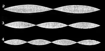 a smooth wave-form, like A in Fig. 4; but, while it vibrates as a whole, in starting the vibration of the string the sudden jerk on it will run along the string in a sort of wabble-wave to its ends and back again, as long as the string vibrates.